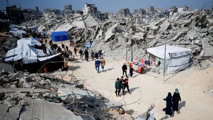 Palestinians walk on a street among the rubble of buildings destroyed during the Israeli offensive, amid a ceasefire between Israel and Hamas, at Jabalia refugee camp, northern Gaza Strip, February 17, 2025. Picture: Reuters, Mahmoud Issa