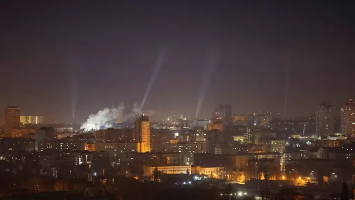 Ukrainian service personnel use searchlights as they search for drones in the sky over the city during a Russian drone strike in Kyiv, Ukraine, February 23, 2025. Picture: Reuters, Gleb Garanich