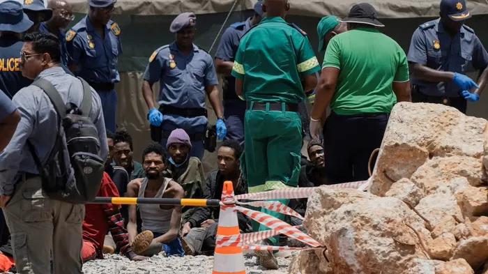 Rescued miners are seen as they are processed by police at a mine shaft where ongoing attempts are being made to retrieve illegal miners who have been underground for months in Stilfontein, January 14, 2025. Picture: Reuters, Ihsaan Haffejee