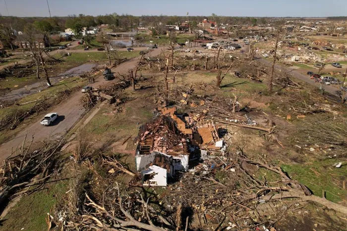 An aerial view of destroyed homes after thunderstorms spawning high straight-line winds and tornadoes ripped across the state in Rolling Fork, Mississippi, US, March 25, 2023. Picture: Reuters, Cheney Orr