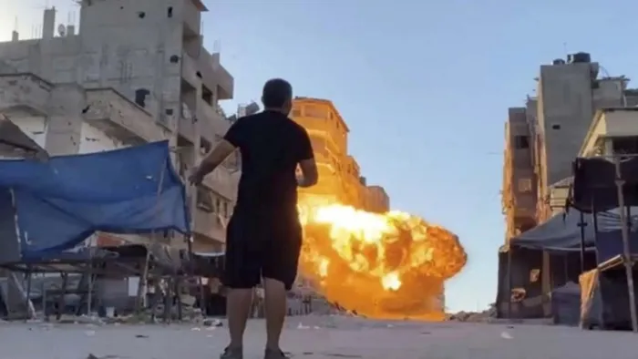 Flames rise after an Israeli strike on a residential building, amid the conflict between Israel and Hamas, in Gaza City, in this screen grab taken from a video, on Sunday. Picture: Reuters TV