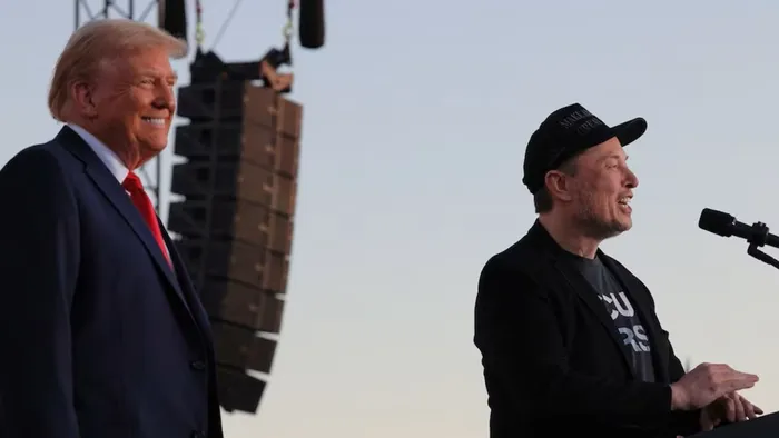 Tesla CEO and X owner Elon Musk speaks as Republican presidential nominee and former US president Donald Trump looks on during a campaign rally at the site of the July assassination attempt against Trump, in Butler, Pennsylvania, US, October 5, 2024. Picture: Reuters, Brian Snyder
