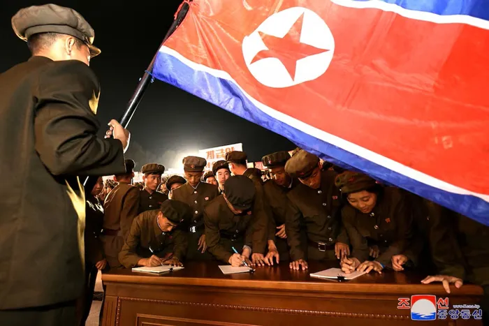 Young people, including students and youth league officials, sign petitions to join or return to the army this week, according to North Korean state media, at an undisclosed location in North Korea, in this undated photo released by North Korea's official Korean Central News Agency October 16, 2024. Picture: KCNA via Reuters