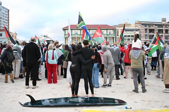 Pro-Palestinian activists participate in the "Scream for Gaza" solidarity event, forming a human chain along the shoreline of Muizenberg Beach