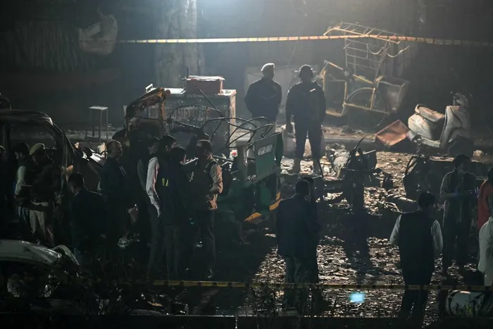 Police and security personnel stand behind the safety cordons delimiting the blast site as they inspect charred vehicles following an explosion near the Red Fort, in the old quarters of Delhi, on November 10, 2025.