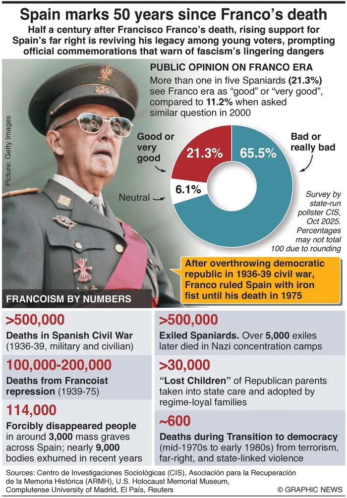 Half a century after Francisco Franco’s death, rising support for Spain’s far right is reviving his legacy among young voters, prompting official commemorations that warn of fascism’s lingering dangers.