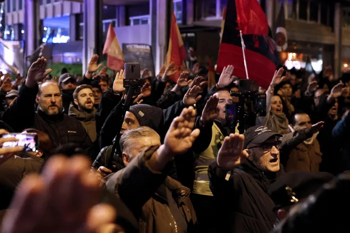 Demonstrators perform the fascist salute during a demonstration called by Falange Espanola de las JONS fascist party in Madrid, on November 21, 2025, marking the 50th anniversary of Spanish dictator Francisco Franco's death. Prime Minister Pedro Sanchez yesterday called on Spaniards to defend the "miracle" of their democracy as the divided country marked the 50th anniversary of ex-dictator Francisco Franco's death. The general's demise on November 20, 1975 ended 36 years of authoritarian right-wing rule that followed a devastating 1936-1939 civil war which brought him to power.