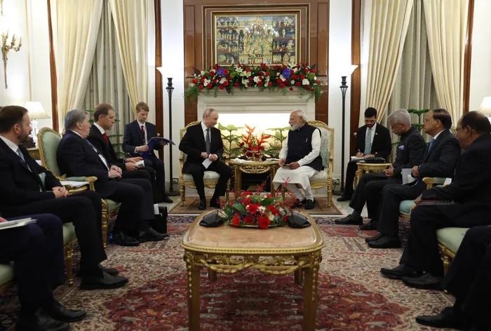 Russia's President Vladimir Putin and India's Prime Minister Narendra Modi hold talks at the Hyderabad House in New Delhi on December 5, 2025.