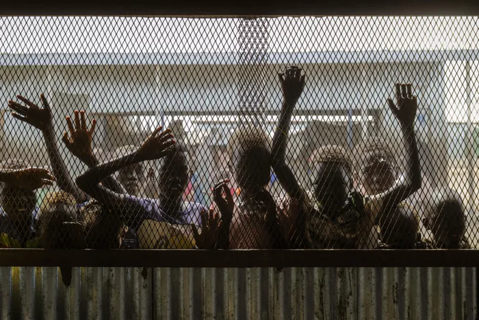 Children gather at the fenced window of a safe-space classroom managed by War Child Holland at the Renk Transit Center in Renk, South Sudan, on November 17, 2025. South Sudan’s Renk Transit Center, built for 3,000, now shelters over 12,000 refugees, returnees, and deportees fleeing the Sudan war that has displaced more than 1 million people since 2023, with thousands living in makeshift tents and straining limited food, water, and medical resources.