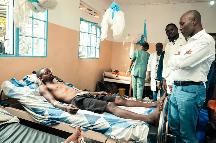 South Kivu Governor Jean-Jaques Purusi Sadiki (R) visits wounded brought to the Uvira General Hospital from the area of intense fightghing between the M23 and Democratic Republic of Congo (DRC) forces in Uvira on December 7, 2025. Some 20 wounded civilians including children were evacuated between Saturday and Sunday from eastern Democratic Republic of the Congo, the Red Cross said, as fighting raged despite an accord signed between Kinshasa and Kigali. DRC President Felix Tshisekedi and his Rwandan counterpart Paul Kagame ratified an agreement in Washington Thursday that was intended to restore peace in eastern Congo, but which so far has had little effect on the ground.