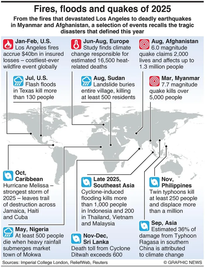From the fires that devastated Los Angeles to deadly earthquakes in Myanmar and Afghanistan, a selection of events recalls the tragic disasters that defined 2025.