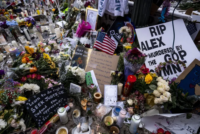 Flowers and people's messages are seen at the makeshift memorial in the area where Alex Pretti was shot and killed by federal immigration agents in Minneapolis, Minnesota, on January 26.
