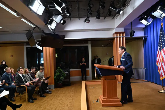 US Deputy Attorney General Todd Blanche speaks during a press conference at the US Department of justice on January 30.