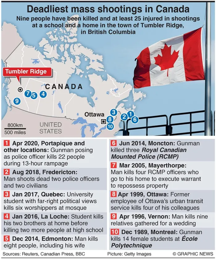 Nine people have been killed and at least 25 injured in shootings at a school and a home in the town of Tumbler Ridge in British Columbia.