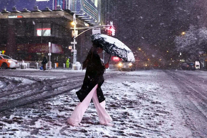 A woman crosses Manhattan's 8th Avenue during a snowfall in New York City, on February 22, 2026. A fast-developing storm is threatening to pummel the US East Coast with a foot (30cm) or more of snow beginning Sunday, bringing Mother Nature's wrath to a region that only just dug out from a previous winter wallop. Meteorologists issued blizzard warnings for New York and parts of at least six states, warning Saturday that heavy snow and gale-force winds are forecast to slam all major cities along the densely populated Interstate 95 northeast corridor, including Philadelphia, Boston and even Washington further south.