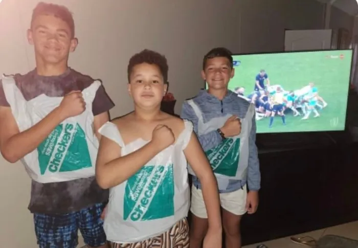 @socialHATchat shared a funny picture of three boys wearing old white and blue Checkers packets with the caption: “Fitting @Springboks supporter kit for South Africans these days anyway. So proud”