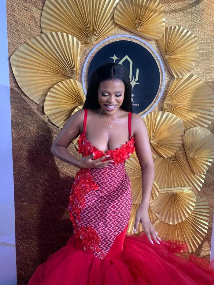 "Blood & Water" star Natasha Tahane also arrived for the big occasion, wearing red, fitted dress with vibrant detailing.