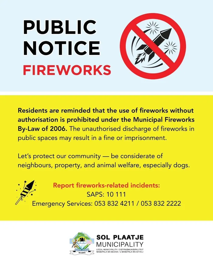 The Sol Plaatje Municipality’s ban on unauthorised fireworks strictly prohibits public‑space discharges, with offenders facing fines or imprisonment to protect residents, property and pets.