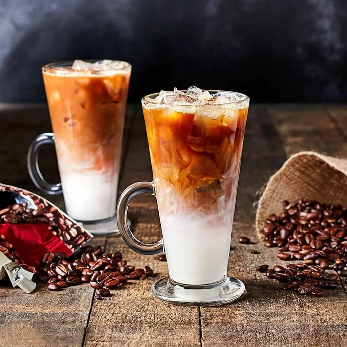 It is designed to mimic the specific look of an iced latte inside a high-end, ribbed Baccarat-style glass, complete with the "frosted" exterior and "liquid" movement inside.