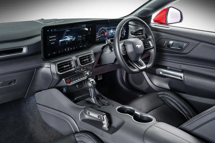 The interior is where we see the biggest changes, with the previous Mustang’s more traditional ‘double brow’ dashboard (which harked back to the 1964 original) making way for a large dual-screen cockpit that could just as well have been lifted from the latest Chinese SUV on the market.