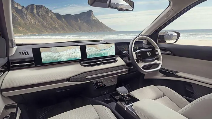 The interior of the new Tata Sierra was designed to mimic the airy and futuristic appearance of the exterior, with three screens stretching across the dashboard beneath a single panel and a large panoramic sunroof bathing the cabin in light.