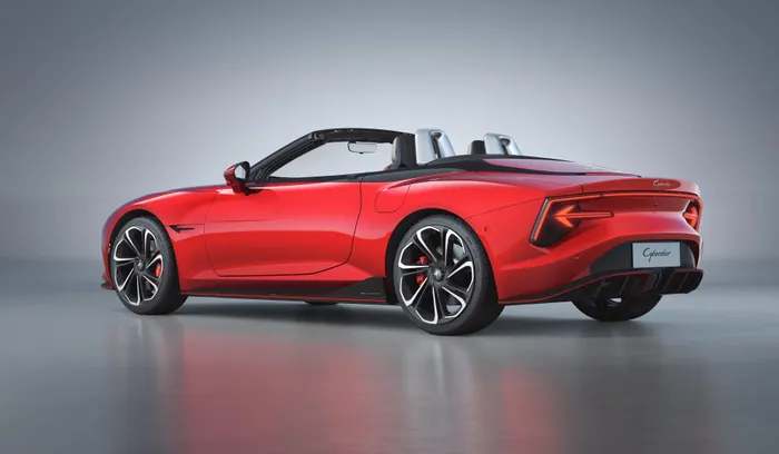 With its stretched bonnet and low slung stance, “K-tail” designed rear end to reduce drag, sleek Storm Eye LED lights, 20-inch machine-faceted alloys and Union Jack tail lights in a nod to its British heritage, the Cyberster would not look out of place at an exclusive sportscar gathering with Italian and German metal costing a few million rand more.
