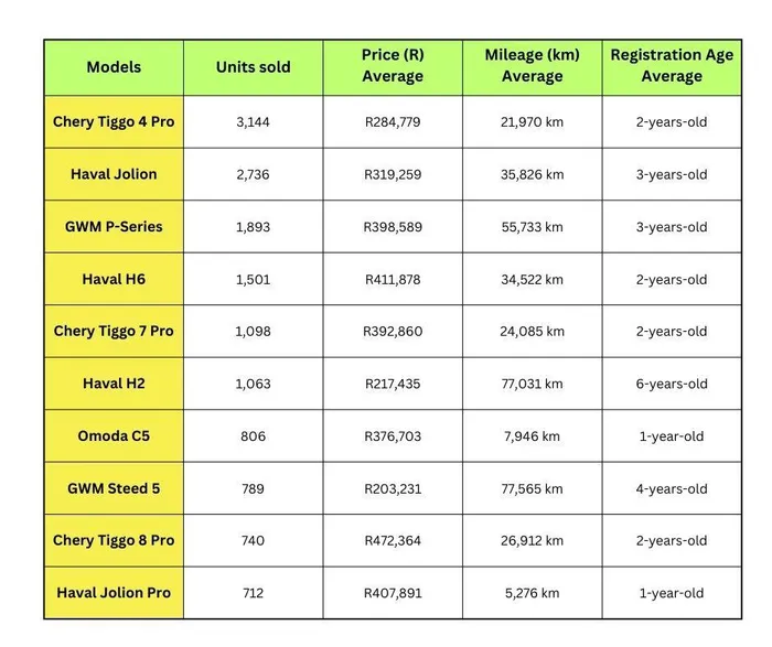 According to AutoTrader’s latest figures, these were the 10 best-selling used Chinese vehicles in South Africa in 2025, at a glance