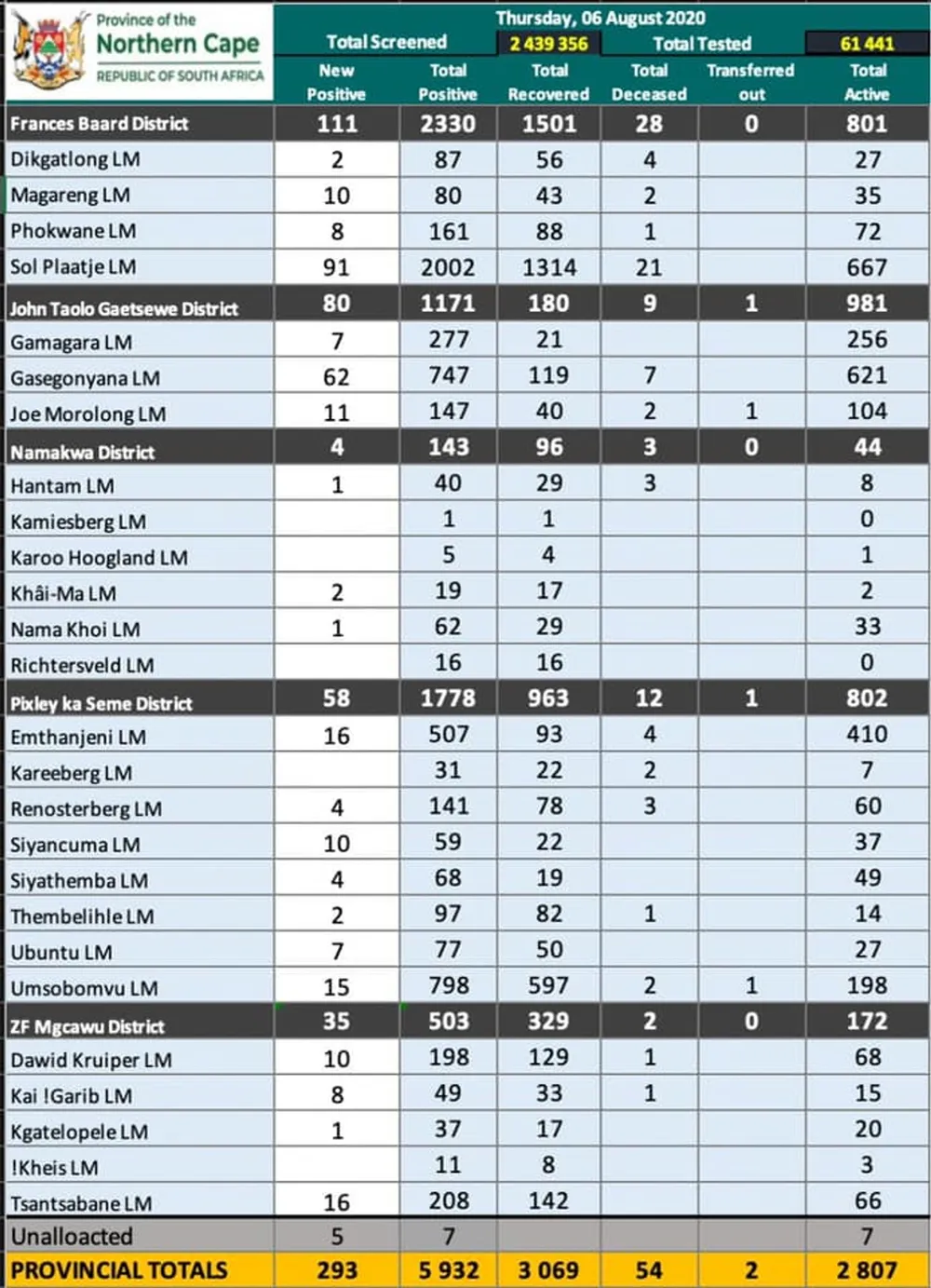 “A cumulative total of 5 932 people in the Northern Cape have tested positive for Covid-19. The Frances Baard District recorded the highest number of new cases with 111, John Taolo Gaetsewe District recorded 80 new cases, Pixley ka Seme District recorded 58 new cases, ZF Mgcawu District recorded 35 cases and the Namakwa District recorded four new positive cases,”