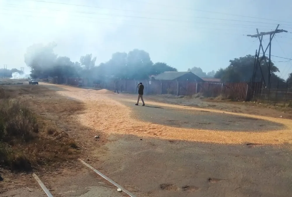 PROTEST action resumed in Jan Kempdorp on Monday, with tyres being set alight and roads blocked, while maize meal that was being transported by a heavy-duty truck was spilled onto the road.