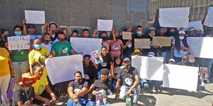 Colville community members oppose bail for murder accused Milton Williams outside the Kimberley Magistrate’s Court. Picture: Danie van der Lith