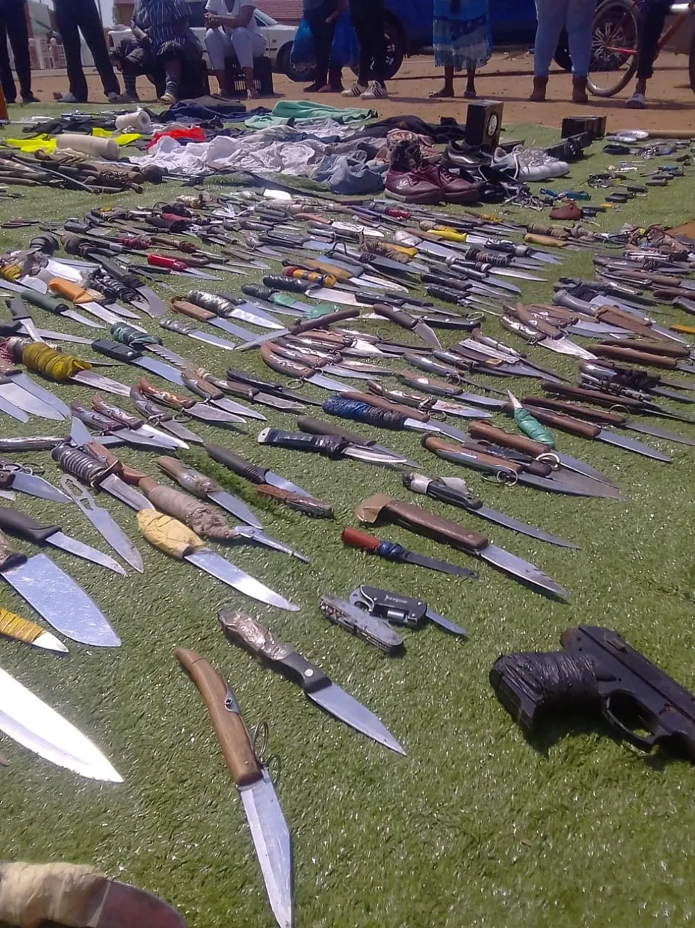 “We confiscated home-made knives in Phomolong and Ipopeng. The other weapons were found in Soul City, Club 2000, Homevale, Homelite, Galeshewe, Lerato Park and Floors during street patrols and raids that were conducted since March this year. We did not want to hand over these weapons to the police. It was decided instead to destroy them to prevent them from finding their way back onto the streets and into the hands of thugs and gangsters. The remains of the weapons will be taken to the scrap yard on Monday,” said Kgobi.