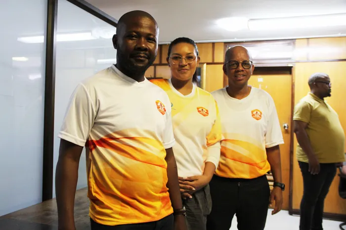 Race director and president of Athletics Griqualand West, Thata Setlholo, with Carey Moraladi and Neo Maneng from the Premier’s Office, wearing Diamond and Dorings Kimberley Big Hole Marathon branded T-shirts.
