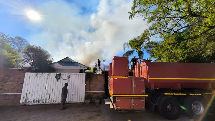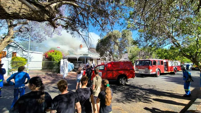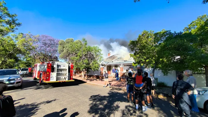 Plumes of smoke billow from the roof of a house in Milner Street in Kimberley, as passers-by stop to make sense of the events unfolding before them.