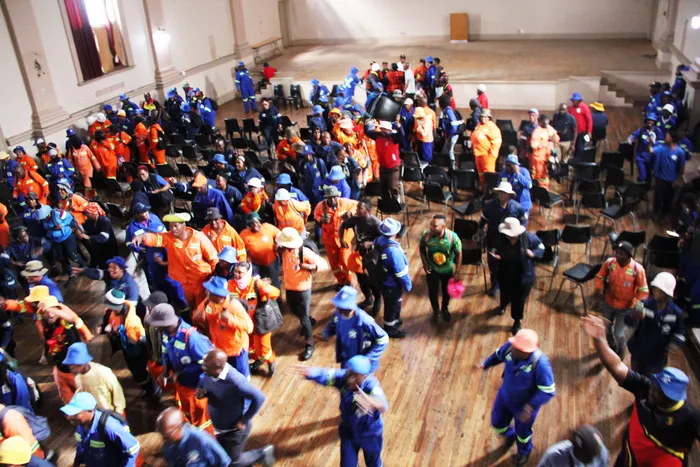 Workers depart for a march from the City Hall to the Sol Plaatje municipal offices.