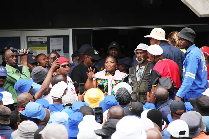 The acting municipal manager, Busisiwe Mgaguli, addresses workers.