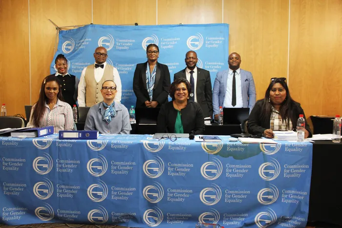 Front row, from left to right: Commissioner Advocate Thando Gumede, Commissioner Dr Charnell Naidu, Commissioner Seehaam Samaai and CGE deputy chairperson Prabashni Subrayan-Naidoo. Back row, from left to right: Northern Cape education officer Keneilwe Mokalane, Northern Cape provincial manager Solly Ngoveni, researcher Thandi Matshazi, Mpumalanga legal officer Sandile Useni and Legal HOD Tsietsi Shuping.