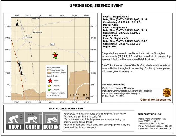 A smaller magnitude‑3.1 aftershock struck the same day at 7.02pm, located 25km south-east of Springbok, also at a shallow depth and felt only weakly (MMI III) by a few locals.