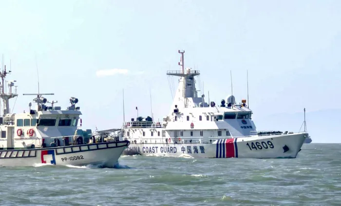 A Taiwanese coast guard ship (left) sends warnings to a Chinese coast guard ship in the waters off Taiwan's Cape Fugui.