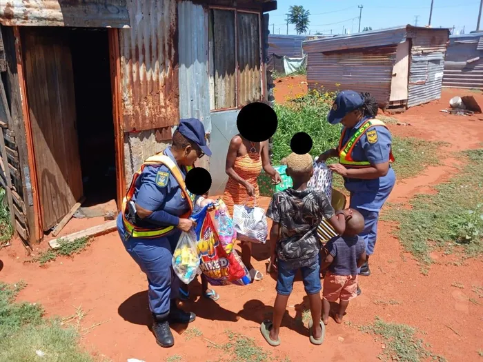 Sergeant Lillian Moroka and a fellow Northern Cape police officer deliver donated items to four children and their parents in Kimberley.