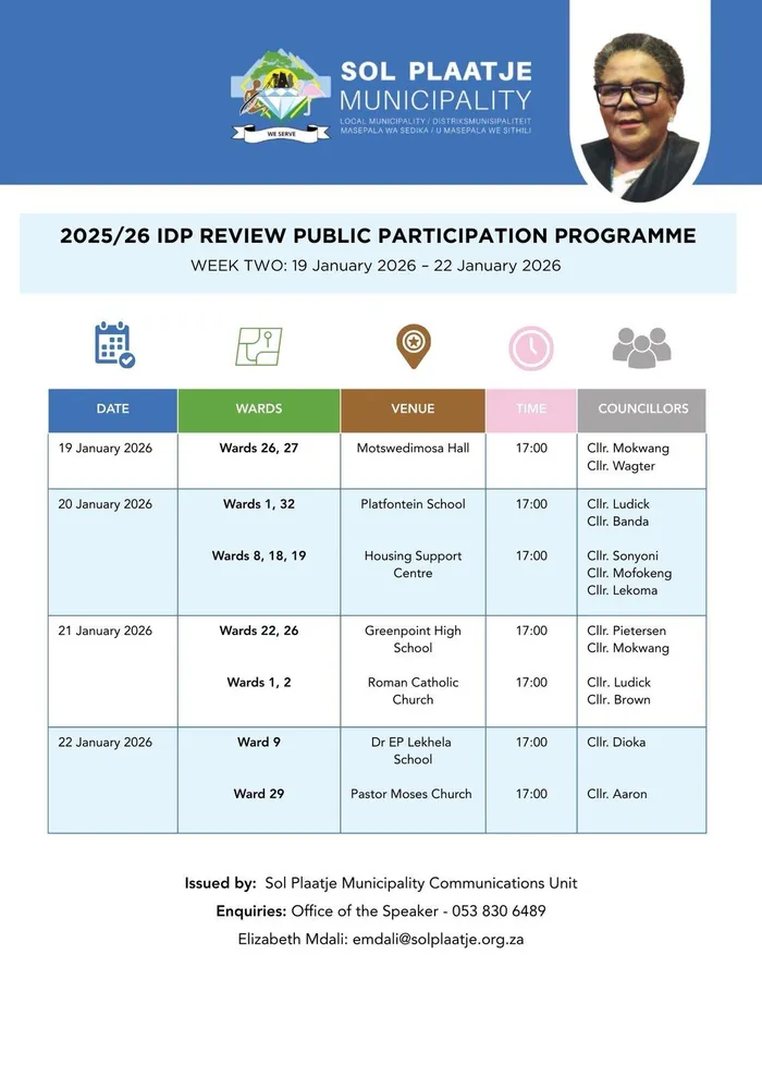 She encouraged the public to attend as the the Integrated Development Programme (IDP) review for the 2025/2026 financial year meetings that commenced on January 12 in ward 14, 23, 24 and 28.