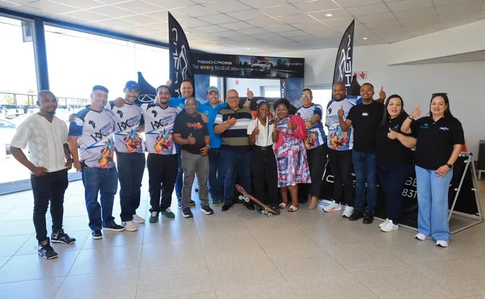 Kimberley skateboarder Boipelo Awuah has become South Africa’s first skater to receive a car sponsorship, partnering with Chery Kimberley as a brand ambassador. From left: Shuaib Panker (sales executive), Karabo Letsika (sales executive), Boipelo Awuah, Jean Retief (sales manager), and PG Weldhagen (dealer principal).