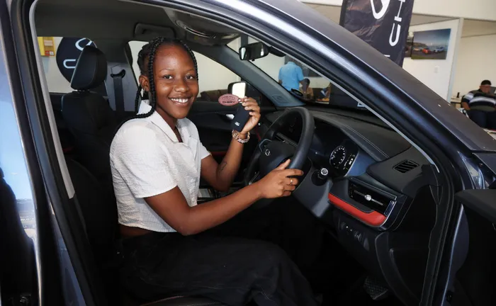 Boipelo Awuah sits in her new Chery Tiggo 4 Pro sponsored by Cherry Kimberley.