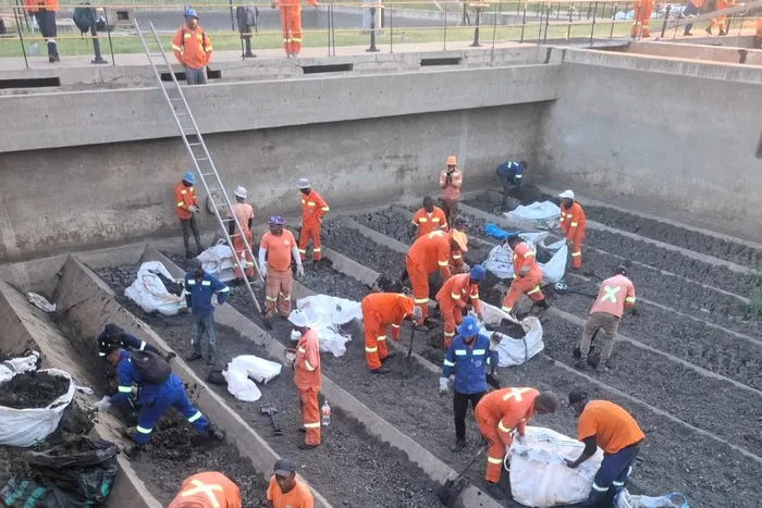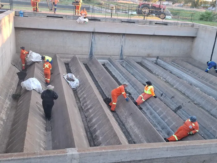 Municipal teams at work during a major clarifier clean-up at the old Riverton water treatment plant as efforts intensify to boost water supply to Kimberley. Sol Plaatje Municipality