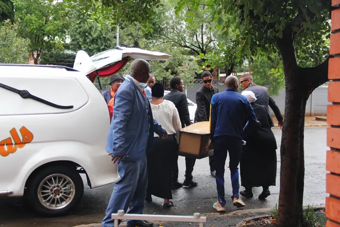 The deceased is loaded into the hearse before his burial at Kenilworth Cemetery.