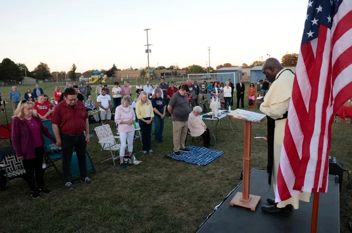 Pastor Fr. Georges Bidzogo (R) leads a prayer vigil outside Holy Redeemer Church in Burton, Michigan, on September 28, 2025, a few miles from Grand Blanc, where a gunman opened fire at a Mormon church earlier today. Four people were killed and several others injured September 28 after a shooter targeted a Mormon church in Michigan. Picture: AFP