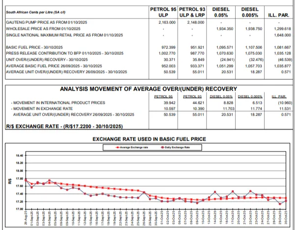 According to data from the Central Energy Fund (CEF), over-recoveries for both petrol and diesel have remained steady throughout October, creating room for reductions.