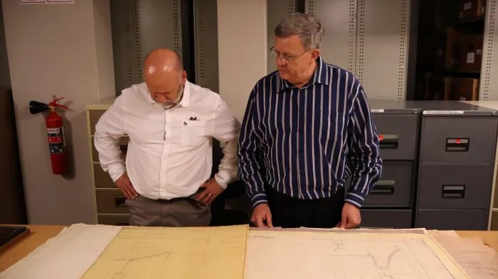 The Erfenisstigting and Akademia have entered into a historic partnership to preserve and expand access to Afrikaans and South African heritage. Marthinus Visser, managing director of Akademia, and Dr. Danie Langner, managing director of the Kultuurtuiste, look at Gerard Moerdijk’s original architectural plans of the Voortrekker Monument, which are preserved in the Erfenisstigting’s archives.