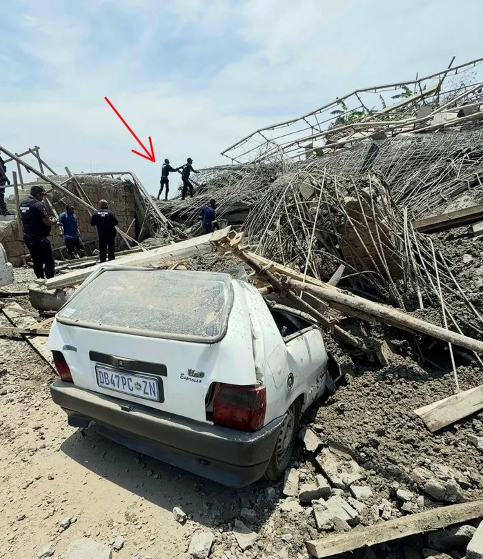 Crews at the site where five people were killed following a structural collapse in Redcliffe, Verulam on Friday