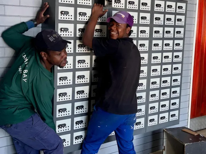 Workers install newly fitted cellphone lockers at Camps Bay High School as the school prepares to implement a bell-to-bell phone-free policy from January 2026.