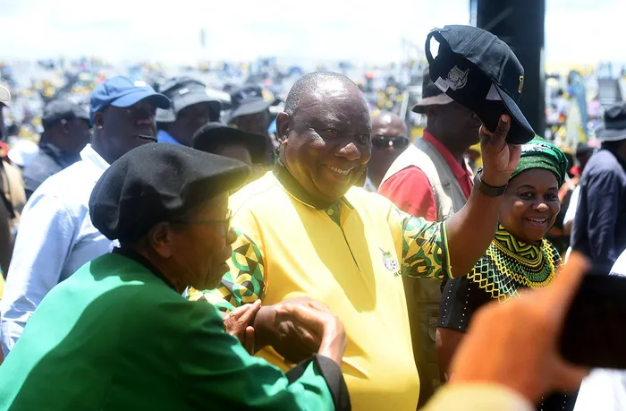 ANC president Cyril Ramaphosa greets members at the party's 114th birthday celebrations.